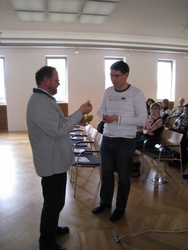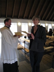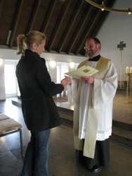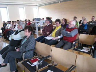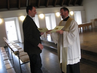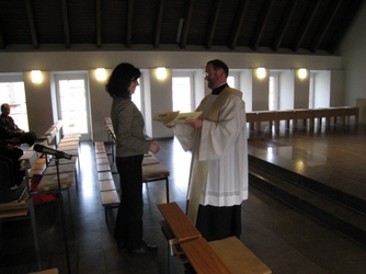 Wer zum ersten Mal als Kommunionhelfer, Kommunionhelferin tätig werden will, steht vor vielen Fragen. Wie reiche ich die Heilige Kommunion in beiderlei Gestalten? Wie bewege ich mich im Altarraum? Was ist bei der Krankenkommunion zu beachten? Beim Einführungskurs in den Kommunionhelferdienst am Samstag, 14. März 2009, im Exerzitienhaus Himmelspforten fanden diese Fragen breiten Raum. Pfarrer Josef Treutlein, Liturgiebeauftragter im Dekanat Würzburg-Stadt, führte die Teilnehmer und Teilnehmerinnen zuvor in die Theolgie der Eucharistie ein. Zum Abschluss des Tages konnte er 45 neuen Kommunionhelfern, Kommunionhelferinnen, vornehmlich aus den drei Würzburger Dekanaten, ihre Bischöfliche Beauftragungsurkunde überreichen.