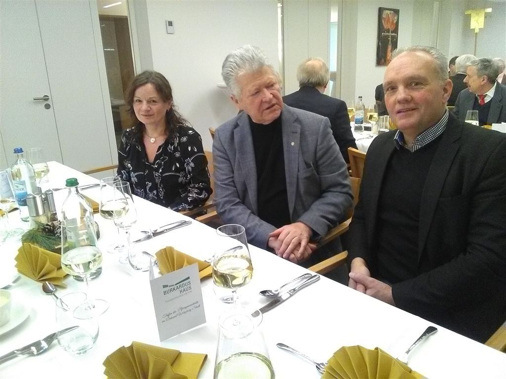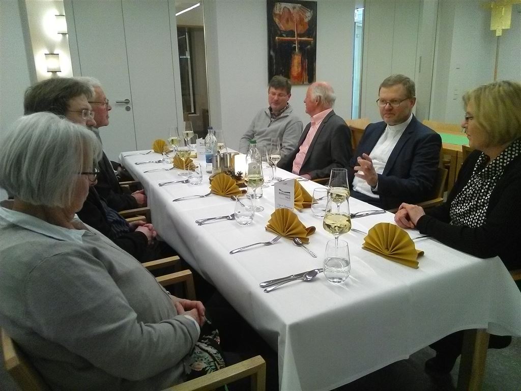 Am Ende der Wahlperiode des amtierenden Dekanatsrates haben Dekan Dr. Jürgen Vorndran und Dekanatsratsvorsitzender Dietrich Preiser die Vorsitzenden der Pfarrgemeinderäte und deren StellvertreterInnen im Dekanat Würzburg-Stadt am Freitagabend, 19. Januar 2018, zu einem festlichen Abendessen mit Erfahrungsaustausch ins Burkardushaus eingeladen. Die Vertreter fast aller Würzburger Pfarrgemeinderäte berichteten von ihrer Arbeit in den vergangenen vier Jahren. Zentrales Thema hierbei war die veränderte gesellschaftliche Situation, die ganz besonders auch in den Kirchen und Pfarrgemeinden zu spüren ist. Der Abbruch an religiöser Praxis ist nicht zu übersehen; viele Angebote passen einfach nicht mehr. Das Bewusstsein der Zugehörigkeit zur Kirche ist jedoch größer als der zurückgehende Gottesdienstbesuch. So kann die Zusammenarbeit in größeren pastoralen Räumen durchaus als Chance gesehen werden. In ersten Ansätzen wird dies auch bereits umgesetzt. Schwächere Gemeinden sind in einem größeren Verbund aufgefangen und aufgehoben. So leiht z. B. die große Nachbarpfarrei MinistrantInnen an die "kleine Schwester" aus. Man möchte in Zukunft den Christen am Rande mehr Raum geben, so ein Resümee der Räte. Als ein gelungenes Beispiel in diese Richtung berichten die Vertreter aus dem Dürrbachtal von ihrem "Forum aktive Gemeinde". Einig war man sich, dass die Pfarrer von den Verwaltungsaufgaben zu entlasten sind, damit sie mehr Zeit für die Seelsorge haben.