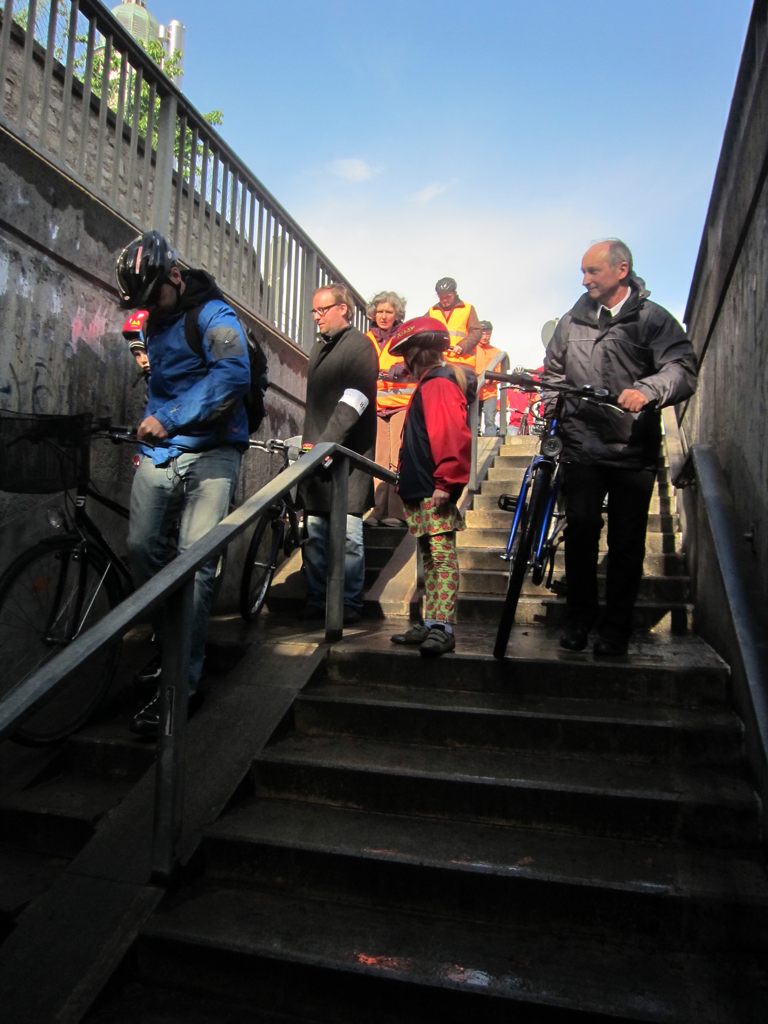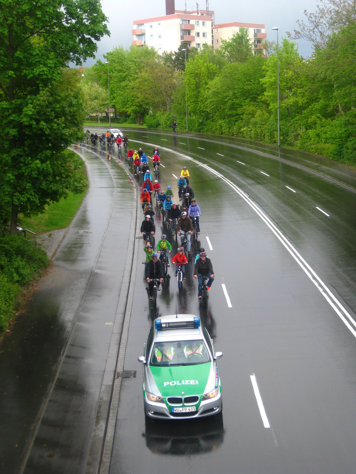 Verbesserungen der Sicherheit sehen sowohl Al Ghusain, als auch Schuchardt für dringend erforderlich. Der vom Arbeitskreises Eine Welt vorgestellte 22 Punkteplan könne da eine Grundlage sein. Besonders die Tunnelbereiche und die fünf Zebrastreifen zeigen, dass diese Strecke in keiner Weise mehr die Anforderungen an eine zeitgemäße Radstrecke erfüllen. Höhepunkt und Schauplatz eines dauerhaften Dilemmas Würzburger Radpolitik war dann die Einfahrt der 150-köpfigen Demonstration in den Berliner Ring. Hart bestand hier auf der Umfahrung sowohl auf dem Radweg und dann auf der Straße. Deutlich wurde hier: Die Führung des Radwegs auf Fußgängerbereichen mit Absperrgittern z.B. an der Ausfahrt Grombühl ist nicht tragbar. Bei steigenden Radverkehr muss die Situation für Radler am Berliner Ring verbessert werden. Weitere Einschränkungen und Streckenverlegungen in Fußgängerbereiche oder über Ampelführungen machen den Radverkehr unsicher und unattraktiv besonders im Vergleich zur Passage des Berliner Platzes auf der Straße.