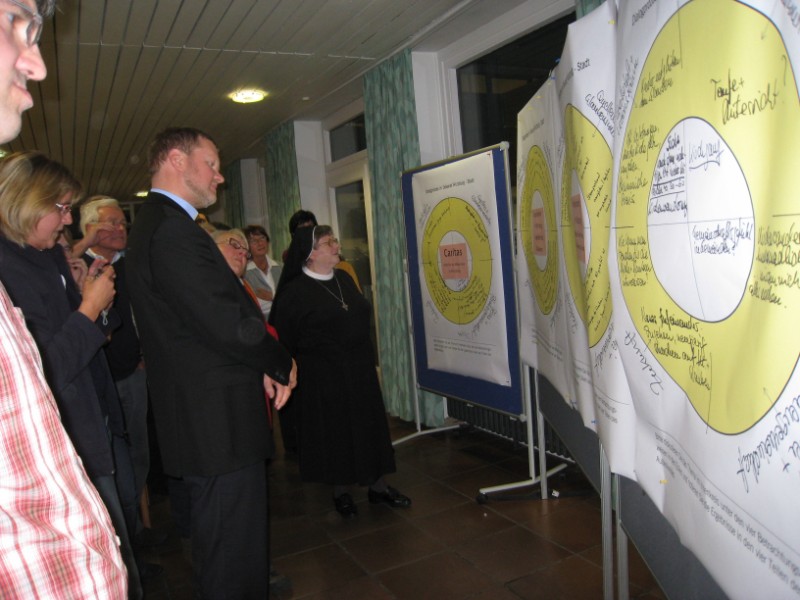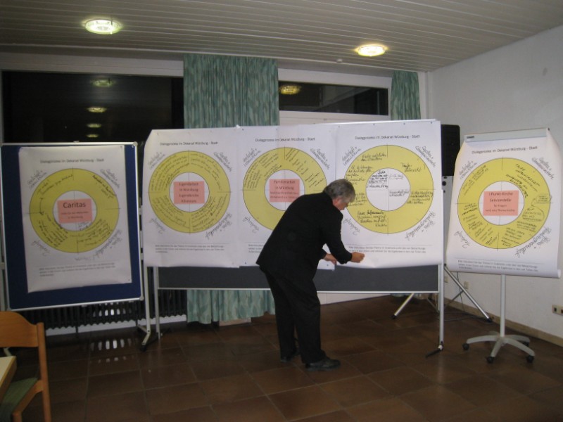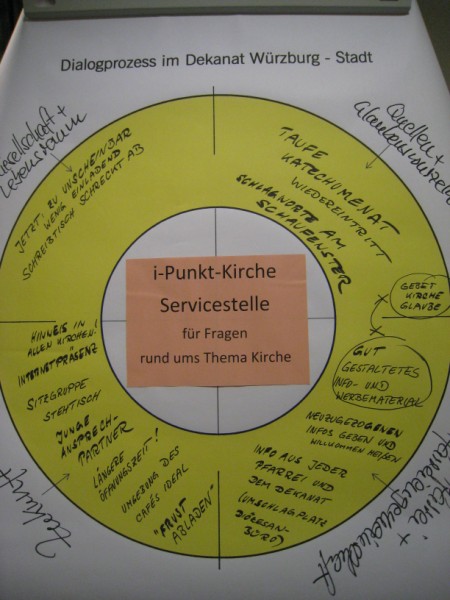 Bei ihrer Herbst-Vollversammlung am 16. Oktober 2012 im Matthias-Ehrenfried-Haus machten sich die Delegierten des Würzburger Dekanatsrates an die Aufgabe, die derzeitigen Ergebnisse des Dialogprozesses in der Diözese mit der Dekanatsentwicklung zu verbinden. In Kleingruppen wurden vier Lebens-,, bzw. Glaubensorte bearbeitet, die der Weiterentwicklung bedürfen: Jugendkriche, Familienpastoral, Caritas, i-Punkt Kirche. Ebenso bestand die Möglichkeit, andere Bereiche der Seelsorge zu benennen. Die sich daraus ergebenden Handlungsoptionen werden an die Koordinationsleiterin des diözesanen Dialogprozesses weitergeleitet. Ebenso wird man sie auf Dekanatsebene weiter verfolgen. Eine gute Gelgenheit, die Handlungsfelder zu konkretisieren, bietet der regionale Dialogtag am 24. November 2012.