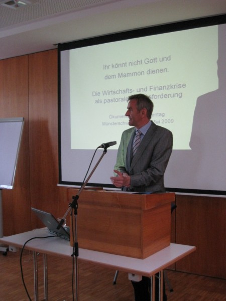 Über 60 katholische und evangelische Seelsorger und Seelsorgerinnen der drei Würzburger Dekanate stellten sich bei ihrem diesjährigen ökumenischen Studientag am 5. Mai 2009 in Münsterschwarzach dem derzeit zentralen Thema der weltweiten Wirtschafts- und Finanzkrise. Zunächst muss man verstehen, was da geschehen ist und geschieht, um dieses Ereignis dann im Licht des Glaubens zu deuten. Dies war Inhalt der ersten Ausführung von Prof. Dr. Alois Halbmayr, dem Inhaber des Lehrstuhles für Dogmatik an der Universität Salzburg. Er zeigte den Verlauf dieser Krise auf, die im Jahr 2001 durch den Zusammenbruch des Aktienmarktes ihren Anfang nahm und zunächst in einer großen Immbolienblase in den USA aufgefangen wurde. Als auch dieser Markt 2007 zusammenbrach, führte dies viele Banken in die Pleite. Weiter stellte er die Frage, welche Herausforderung die Finanzkrise für Kirche und Pastoral hat. Darf sich Kirche in die Ökonomie einmischen? Er zollte dem EKD-Ratsvorsitzenden Bischof Wolfgang Huber großen Respekt, der an Heiligabend 2008 25 Prozent Rendite als Form der Götzendienstes anprangerte. Geld ist zum Gott geworden. Kirche muss hier sehr wohl ihre Stimme erheben, denn das Evangelium ist immer Auslegung der Zeit im Blick auf die Botschaft vom Reich Gottes. Dass dabei Kirche ihre politische Interpretation des Glaubens wiederentdeckte, ist ein mutmachendes Zeichen. Der Referent empfahl, Allianzen mit den veschiedenen Zivilgesellschaften zu suchen und sich an größeren gesellschaftlichen Diskussionen zu beteiligen. Als Beispiel nannte er die gelungene Kooperation von Kirche und Gewerkschaften in Österreich bei der Wahrung des Gebotes der Sonntagsruhe. Am Nachmittag arbeiteten die Teilnehmer und Teilnehmerinnen an verschiedenen Themen, z. B. die Bedeutung der Wirtschafts- und Finanzkrise für die Arbeit in den Gemeinden.