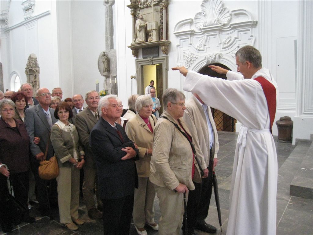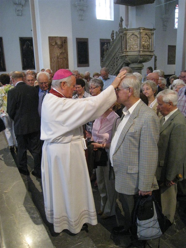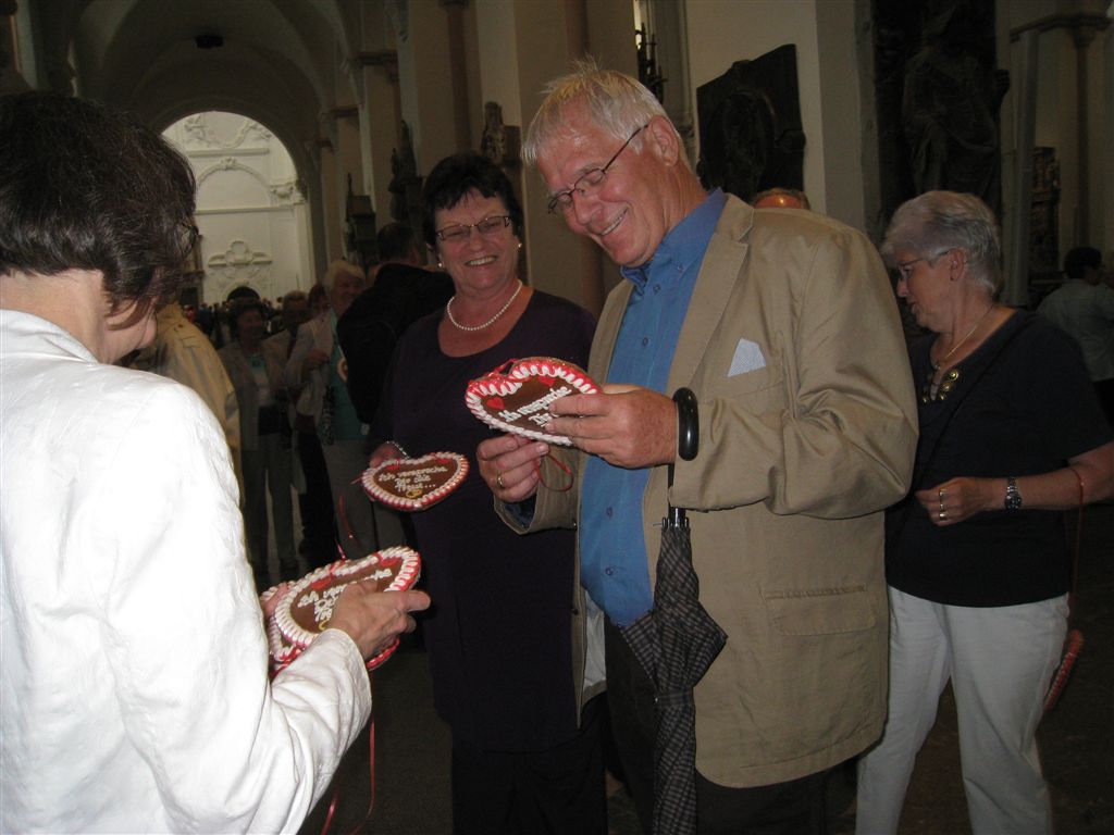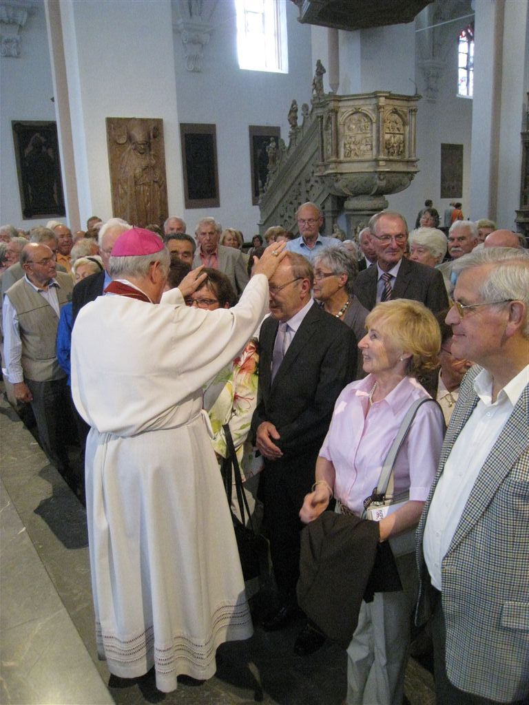 Rund 600 goldene, diamantene und eiserne Hochzeitsjubilare aus den drei Würzburger Dekanaten kamen am Donnerstagnachmittag, 4. Juli 2013, in den St. Kiliansdom, um gemeinsam mit Bischof Dr. Friedhelm Hofmann Dank zu sagen für viele gemeinsame Ehejahre. In seiner Predigt dankte Bischof Hofmann eigens den konfessionsverbindenden Ehepaaren. Sie haben in ihrer Ehe viel für die Überwindung von Glaubensspaltungen getan. Im Anschluss an den Gottesdienst erteilten die anwesenden Bischöfe, Priester und Diakone den Jubelpaaren den Segen. Begehrt waren die Lebkuchenherzen mit der Aufschrift "Ich verspreche Dir die Treue", die zum Schluss des Gottesdienstes verteilt wurden. Die kirchliche Feier fand in einer Begegnung auf dem Kiliansplatz ihre Fortsetzung. Die Silbernen Ehejubilare waren am Tag darauf in den Kiliansdom eingeladen.