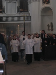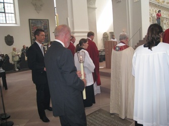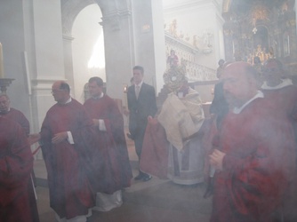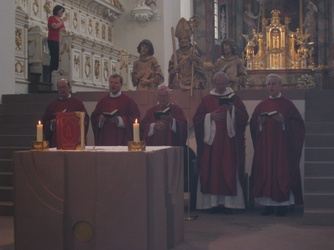 Mit einem Pontifikalamt am Hochfest der Apostel Petrus und Paulus am Montag, 29. Juni, eröffnete Bischof Dr. Friedhelm Hofmann nach zweijähriger Renovierungsarbeit die eucharistische Anbetung im Neumünster. Groß war die Schar der Mitfeiernden, darunter die vielen Frauen und Männer, die ein- oder mehrere Male im Montag eine Stunde die stille, eucharistische Anbetung mittragen. Im Anschluss an den Gottesdienst übertrug Bischof Friedhelm in einer eucharistischen Prozession, zusammen mit den Konzelebranten und Gläubigen, das Allerheiligste in die Anbetungskapelle der Kreuzkrypta. Dort besteht an Werktagen von 7 bis 17 Uhr und sonntags von 10 bis 17 Uhr die Möglichkeit der eucharistischen Anbetung. Am ersten Donnerstag im Monat, dem Gebetstag um geistliche Berufe, ist das Allerheiligste bis 21 Uhr ausgesetzt. Diese Gebetsstunden werden mit einer Eucharistiefeier um 21 Uhr abgeschlossen. Für die Organisation der Anbetung ist das Diözesanbüro Würzburg verantwortlich.