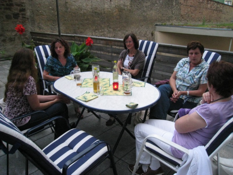 Das Wetter meinte es gut mit den Würzburger Pfarrsekretärinnen, die sich am Dienstag, 26. Juli 2011, auf der Terasse des Diözesanbüros trafen, um das Arbeitsjahr ausklingen zu lassen. Dekan Dr. Jürgen Vorndran ließ es sich nicht nehmen, an diesem Abend mit von der Partie zu sein. Und so lag es in der Natur der Dinge, dass er -als einziges männliches Wesen- auch das Fäßchen Bier anstechen durfte. In einer Vorstellungsrunde machten sich die Damen dem Dekan bekannt, bevor man sich den leiblichen Genüssen zuwendete. Diese gemeinsamen Unternehmungen sind eine Wohltat für das Arbeitsklima, weit über die Pfarreigrenzen hinaus.