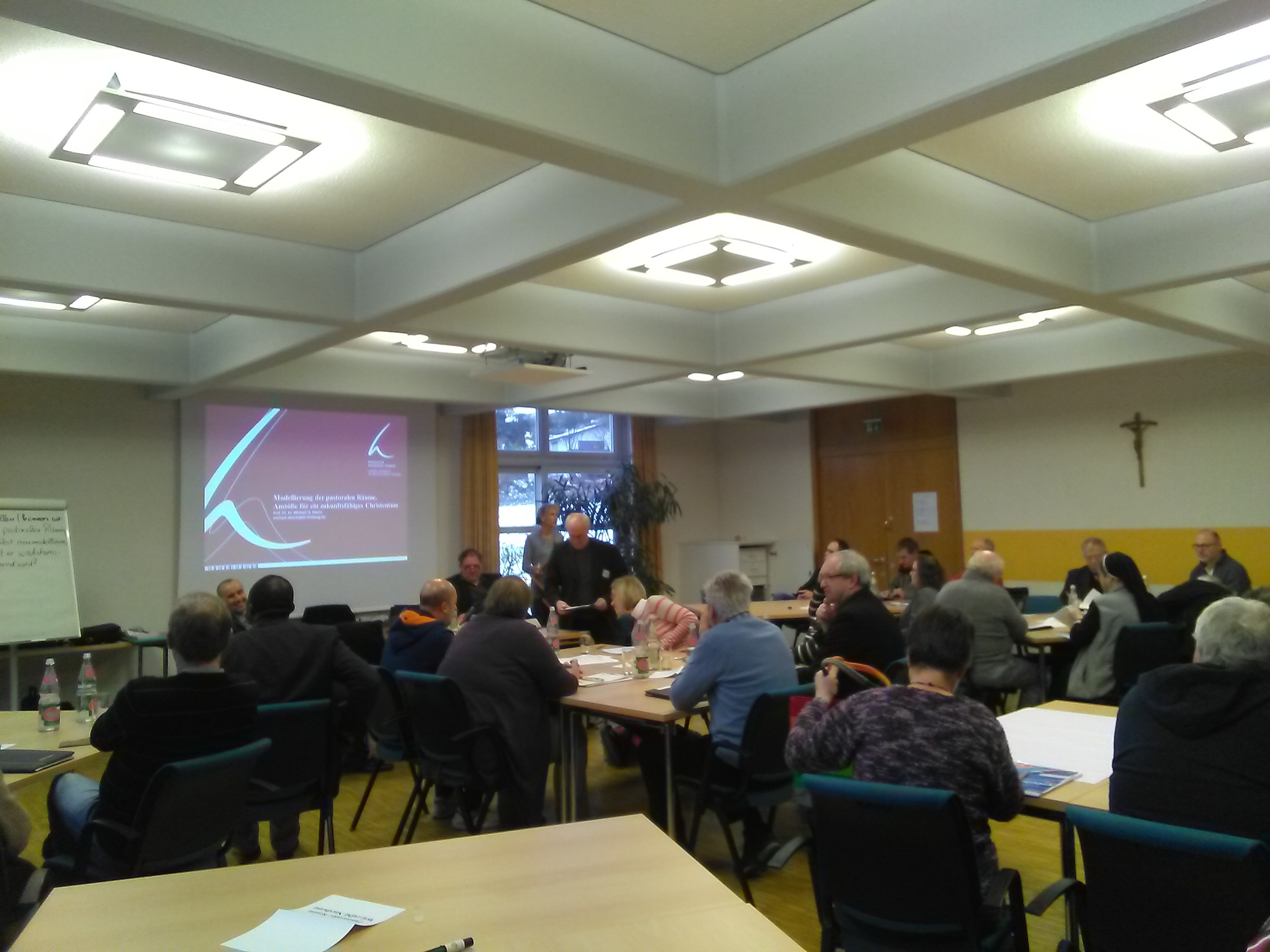 Die Seelsorgerinnen und Seelsorger des Dekanates Würzburg rechts des Mains kamen gemeisnam mit den Kolleginnen und Kollegen aus dem Dekanat Kitzingen vom 24. bis 26. Januar 2017 im Bildungshaus Schmerlenbach zusammen, um zu überlegen, wie trotz veränderter gesellschaftlicher und personeller Situation die Pastoral der Zukunft ein Gesicht haben haben. Wie soll die Nähe am Ort einerseits und eine heilsame Vernetzung von katholischer Weiter andererseits in einem größeren pastoralen Raum gelingen? Was die Menschen unserer Zeit von Kirche erwarten -oder auch nicht- stellte Professor Dr. Dr. Michael N. Ebertz, Freiburg, zu Beginn der Beratungen dar. Lediglich zwei Milieugruppen sind in den klassischen Pfarrgemeinden vertreten. Doch auch unter den anderen acht Milieus sind ca. 50 % Mitglieder der katholischen Kirche. Diese dürfen nicht einfach unbeachtet bleiben. Ebertz stellt eine massive Erusion der katholischen Reproduktion fest. Die Familie fällt bis auf ganz wenige Ausnahmen als ein Ort der ersten Begegnung mit dem Christentum aus. So gilt es, neue, andere pastorale Orte in den Blick zu nehmen, die bisher nicht gesehen wurden. Ein einfach weiter so in einem größeren pastoralen Raum kann es nicht geben. Dieser Weg führt in eine Sackgasse, in der der Letzte das Licht aus macht. Kirche darf nicht nur als Communio, sondern muss auch als Ministratio verstanden werden (Lumen gentium). Nicht wenige Katholiken erwarten eben nur eine Dienstleistung, und die gilt es gut zu vollziehen. Professor Ebertz ermutigte zu einer Pastoral in einem größeren Raum. Diese sei nicht nur der Not geschultert, sondern setze Charismen und Ressourcen frei. Wie dies konkret aussehen kann, dafür ließen sie die Seelsorger viel Zeit. In getrennten Beratungen wurde der Versuch unternommen, die Struktur der neuen Seelsorgeräume zu umreißen. Dabei ist auf die Lebenswirklichkeit der Menschen vor Ort zu achten. Dekanatsgrenzen spielen hierbei eine sekundäre Rolle. Dies wurde auch von Generalvikar Thomas Keßler bekräftigt, der am Mittwochnachmittag an der Konferenz teilnahm. Die Würzburger kamen überein, den großen Bereich der Stadt Würzburg mit ihrem näheren und weiteren Umfeld als Ganzes in den Blick zu nehmen. Im Dekanat Kitzingen konstituieren sich zwei große pastorale Räume: Kitzingen-West und Kitzingen-Ost. Weitere Gespräche und Beratungen -auch mit den Verantwortlichen in den benachbarten Dekanaten- werden die nächsten Wochen und Monate folgen.