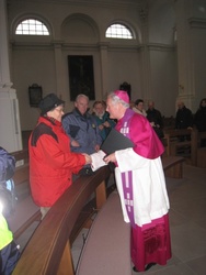 Früh am Donnerstagmorgen, 26. Februar 2009, machten sich Pilger der Hungertuchwallfahrt von ihrem Etappenziel Rottendorf auf den Weg nach Würzburg. Vier Gruppen bewältigen die etwa 250 Kilometer lange Strecke von Fulda nach Stuttgart. Dort werden die Pilger an der bundesweiten Eröffnung der Fastenaktion Misereor am kommenden Sonntag teilnehmen. Dabei tragen sie das Hungertuch durch die Straßen der Städte und Gemeinden und setzen so ein Zeichen für Gerechtigkeit und die Bewahrung der Schöpfung. Bischof Dr. Friedhelm Hofmann, Dekan Erhard Kroth und Mitglieder der Pfarrei Stift Haug feierten zusammen mit den Pilgern eine Andacht in ihrer Pfarrkirche. Am Ende erteilte ihnen der Bischof den Pilgersegen. Eine Gruppe, begleitet von Pilgern aus Stift Haug, zog mit dem Hungertuch nach Randersacker weiter. Die nach Würzburg Gewallten stärkten sich bei einem Frühstück im Matthias-Ehrenfried-Haus.