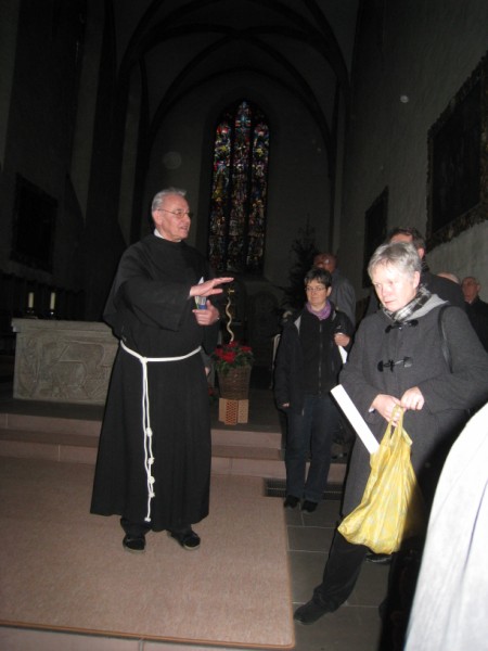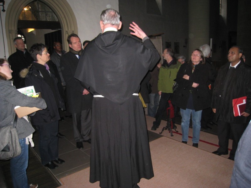 Die Pfarrer, Diakone und hauptamtlichen pastoralen Mitarbeiterinnen und Mitarbeiter des Dekanates Würzburg links des Mains statteten am Dienstag, 10. Januar 2012, dem Würzburger Franziskanerkloster einen Besuch ab. Nach einer Andacht in der Valentinuskapelle führte Pater Leo Beck die SeelsorgerInnen durch die Klosterkirche, deren Grundmauern über 700 Jahre alt sind. Bereits im 13. Jahrhunderten ließen sich Franziskaner in Würzburg nieder. Ihre erste Aufgabe war die Betreuung des Siechenhauses vor den Toren der Stadt, am heutigen Wöllrieder Hof. Diese Tradition griff Bruder Tobias Matheis nach seinem Klostereintritt wieder auf. Als gelernter Krankenpfleger und Rettungssanitäter hat er die "Würzburger Straßenambulanz" aufgebaut. Mit seinem Dienst auf den Straßen Würzburgs sorgt er für eine pflegerische Basisversorgung Obdachloser. Dabei ist er mit verschiedenen sozialen Einrichtungen, wie die Bahnhofsmission, Wärmestube, Gefährdetenhilfe, streetwork etc. vernetzt. Dieses niederschwellige Angebot hat die franziskanische Gemeinschaft im Herzen der Stadt neu ins Bewusstsein der Würzburger Bürger gebracht. Nicht wegzudenken sind die Brüder des Heiligen Franz von Assisi im liturgischen Leben der Stadt. Und das jährliche Sommerfest lockt nicht nur wegen des guten Klosterbiers unzählige Besucher an den Franziskanerplatz.
